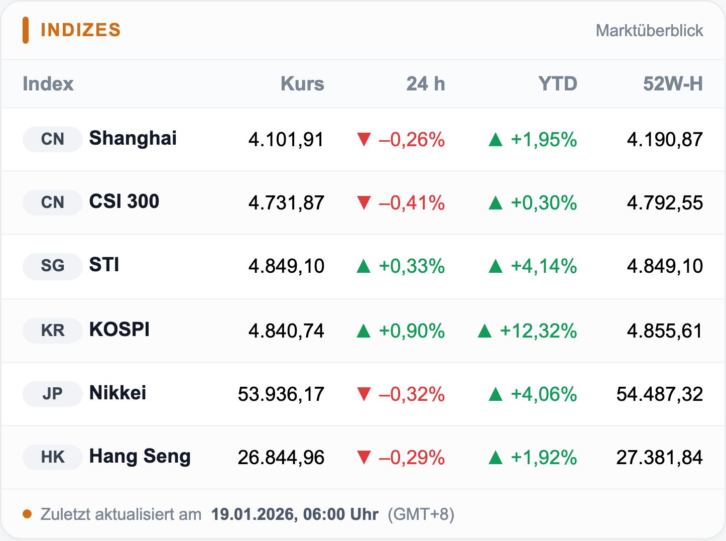 Asien startet verhalten, Blick auf China-Daten: Die Märkte gaben nach, belastet von Trumps Greenland-Zolldrohungen und der Nervosität vor Chinas BIP- und Konjunkturdaten.