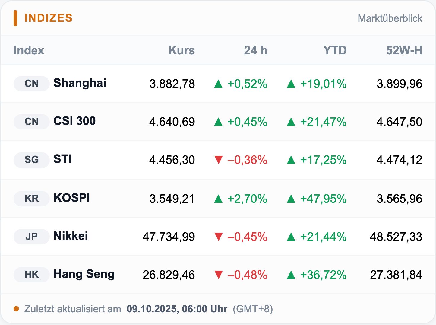 Trotz der leichten Abkühlung bleibt der übergeordnete Trend intakt: Der World Bank-Ausblick für Asien wurde nach oben revidiert und die Goldpreise kletterten erstmals über die Marke von 4.000 USD. Investoren setzen angesichts des US-Shutdowns und geopolitischer Risiken auf Sicherheit.