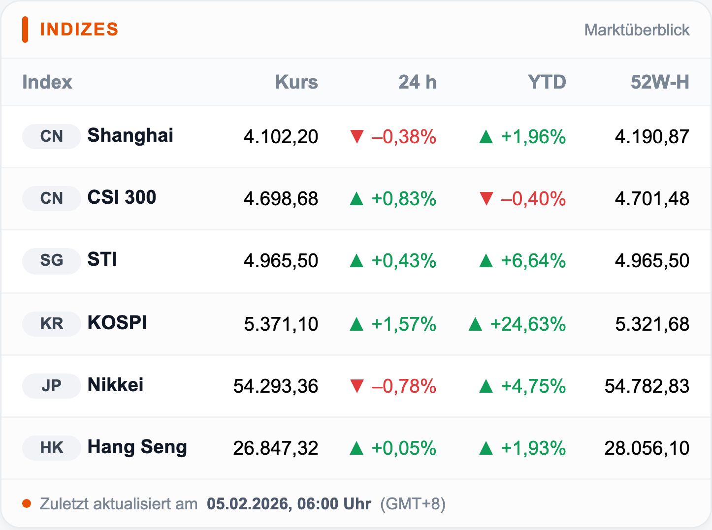 Asien startet schwächer in den Tag, weil an der Wall Street ausgerechnet die Tech-Lieblinge verkauft wurden. Japan trifft’s am härtesten: Chip-Zulieferer wie Lasertec rauschen um 7 Prozent ab, Konami um 5,8 Prozent, Tokyo Electron um 3,2 Prozent.