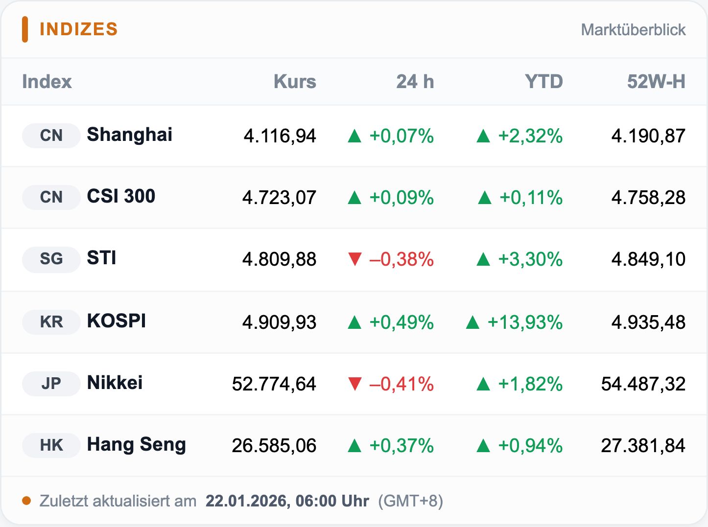 Asiatische Anleger unbeeindruckt vom Wall-Street-Ausverkauf: Trumps Grönland-Verstöße plus neue Zolldrohungen sorgen für Risiko. Chips bleiben in Asien aber weiterhin stabil, Banken und Industriewerte rutschen leicht mit.
