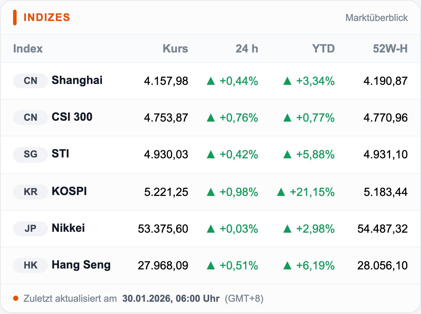 Asiens Märkte zeichnen nach Fed-Pause im Plus, nachdem die US-Notenbank erwartungsgemäß die Zinsen unverändert ließ. Der Fokus rückt zurück auf Gewinne und KI-Stories. Ein schwächelnder Dollar spielt Kapitalzuflüssen Richtung Asien in die Karten.